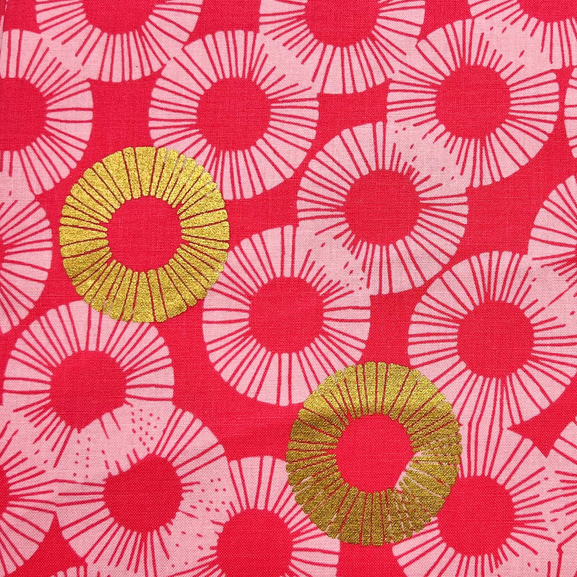 Tessuto a sfondo rosa con fantasia geometrica e dettagli oro metallizzati