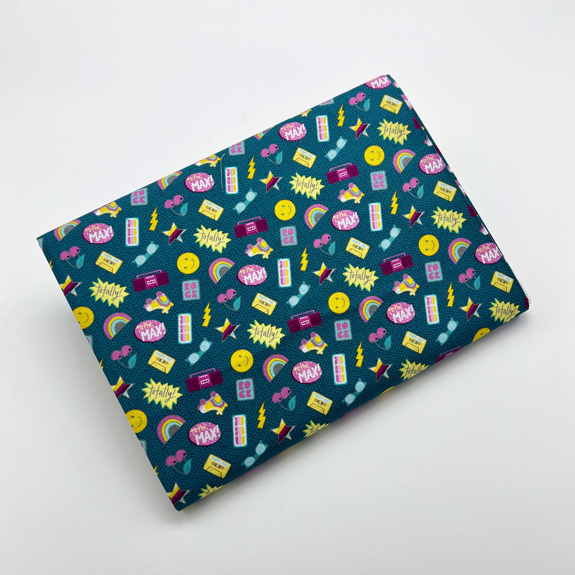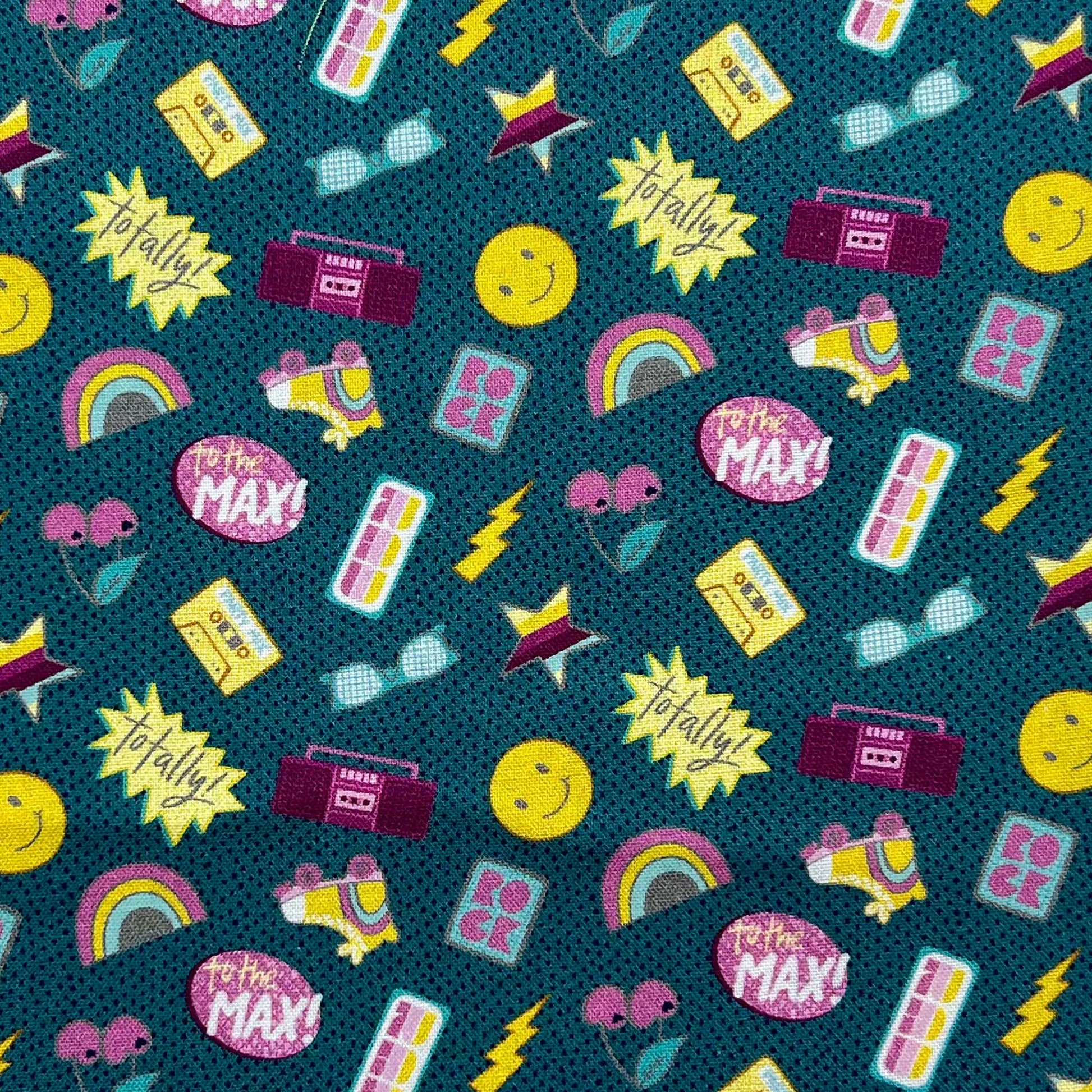 Tessuto a fantasia anni ottanta su fondo petrolio
