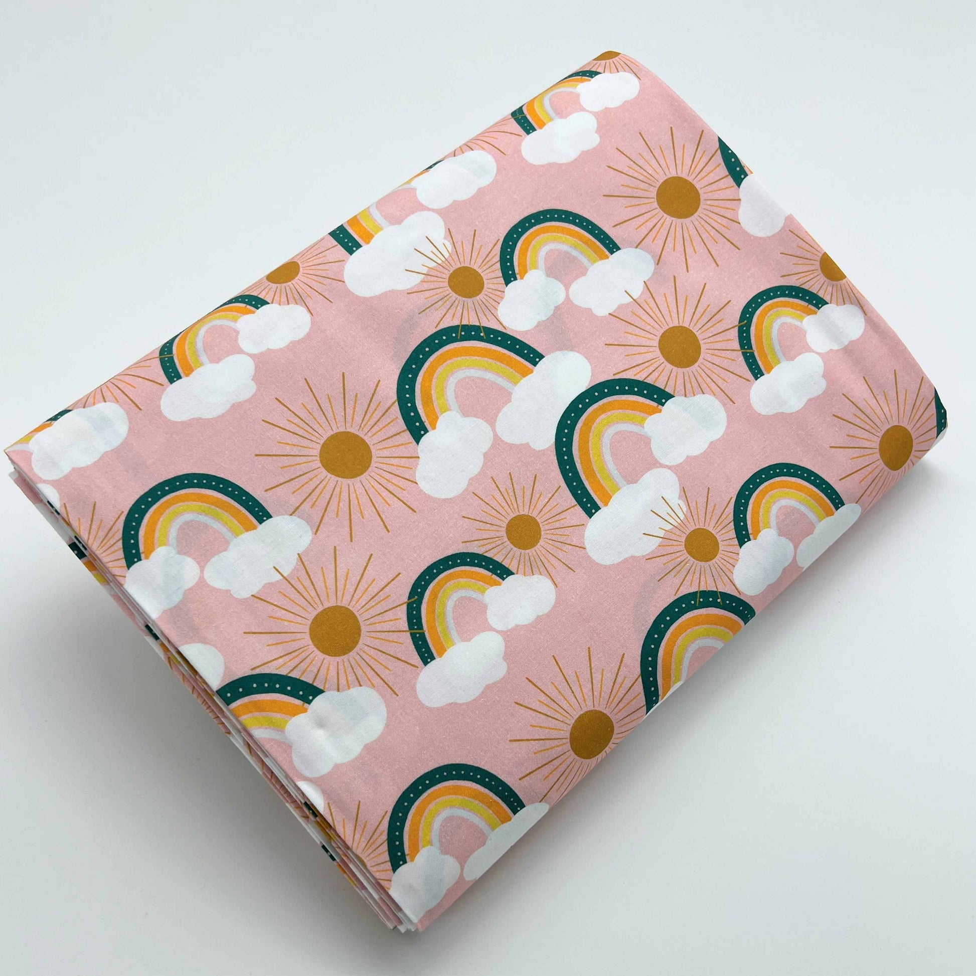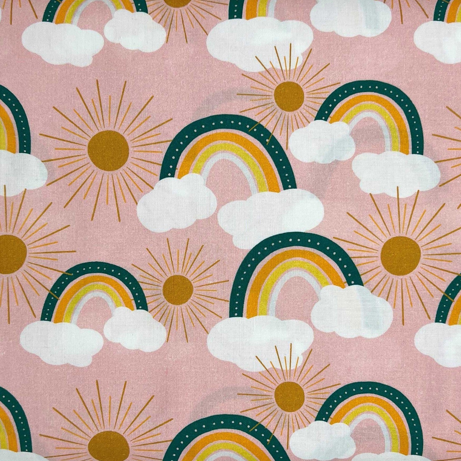 Tessuto a fantasia con arcobaleni e soli su fondo rosa
