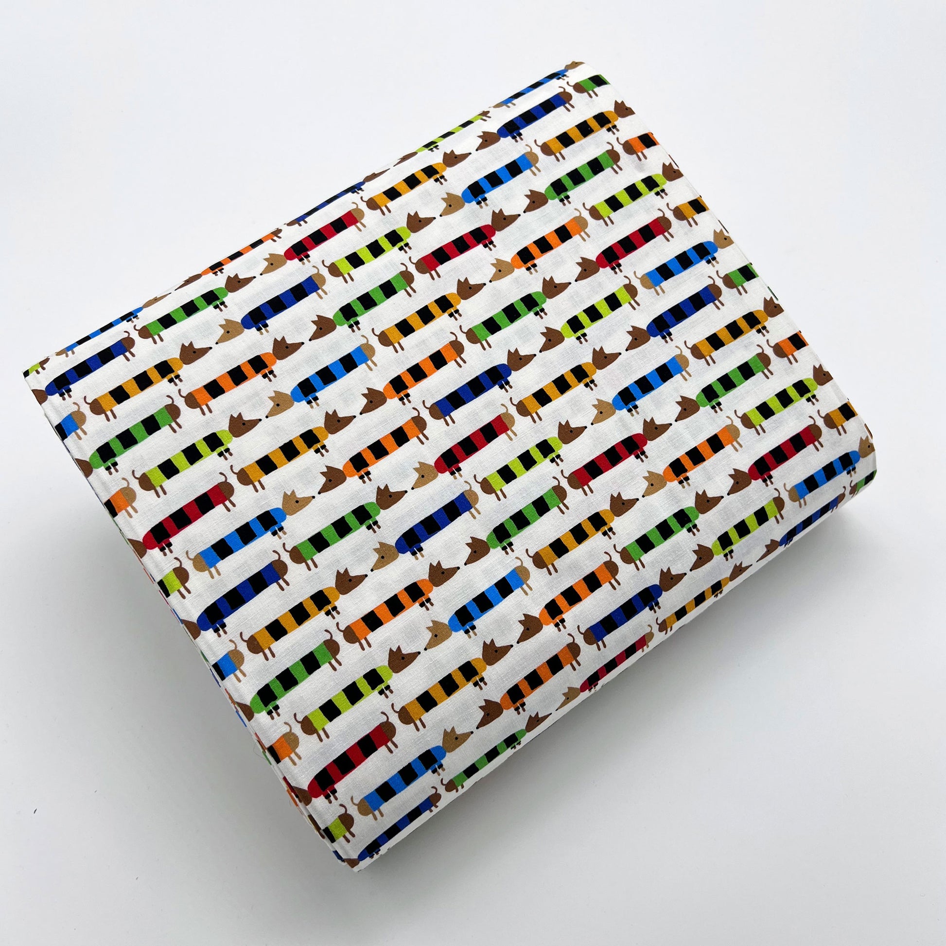 Tessuto a fantasia con bassotti colorati su fondo bianco