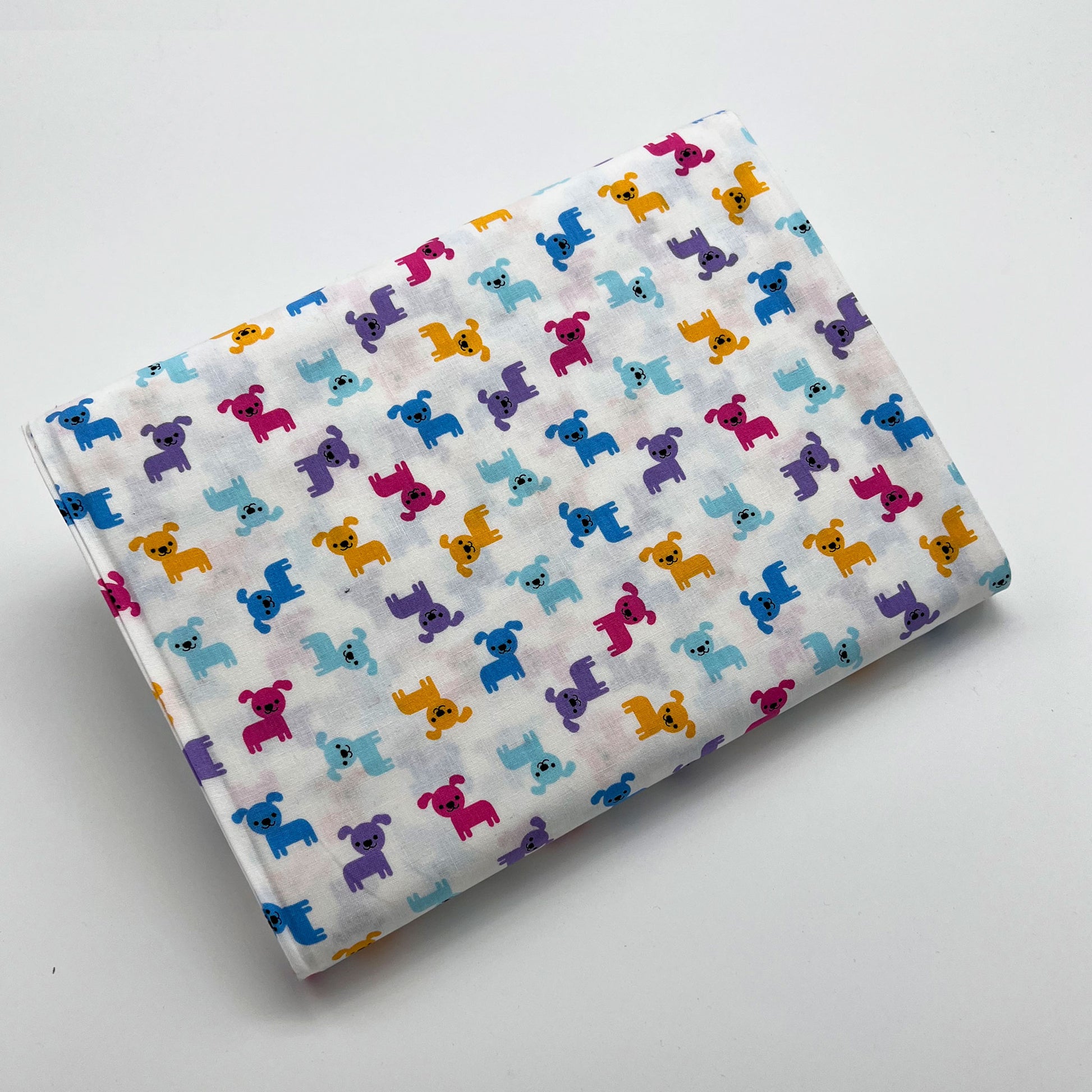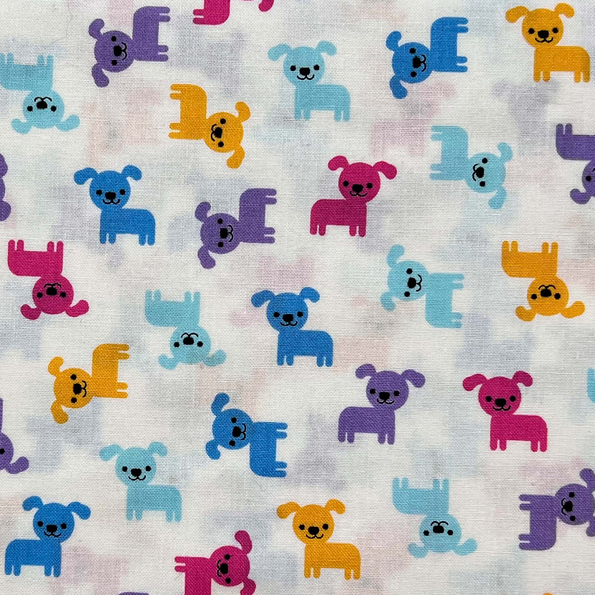 Tessuto a fantasia con cagnolini colorati su fondo bianco