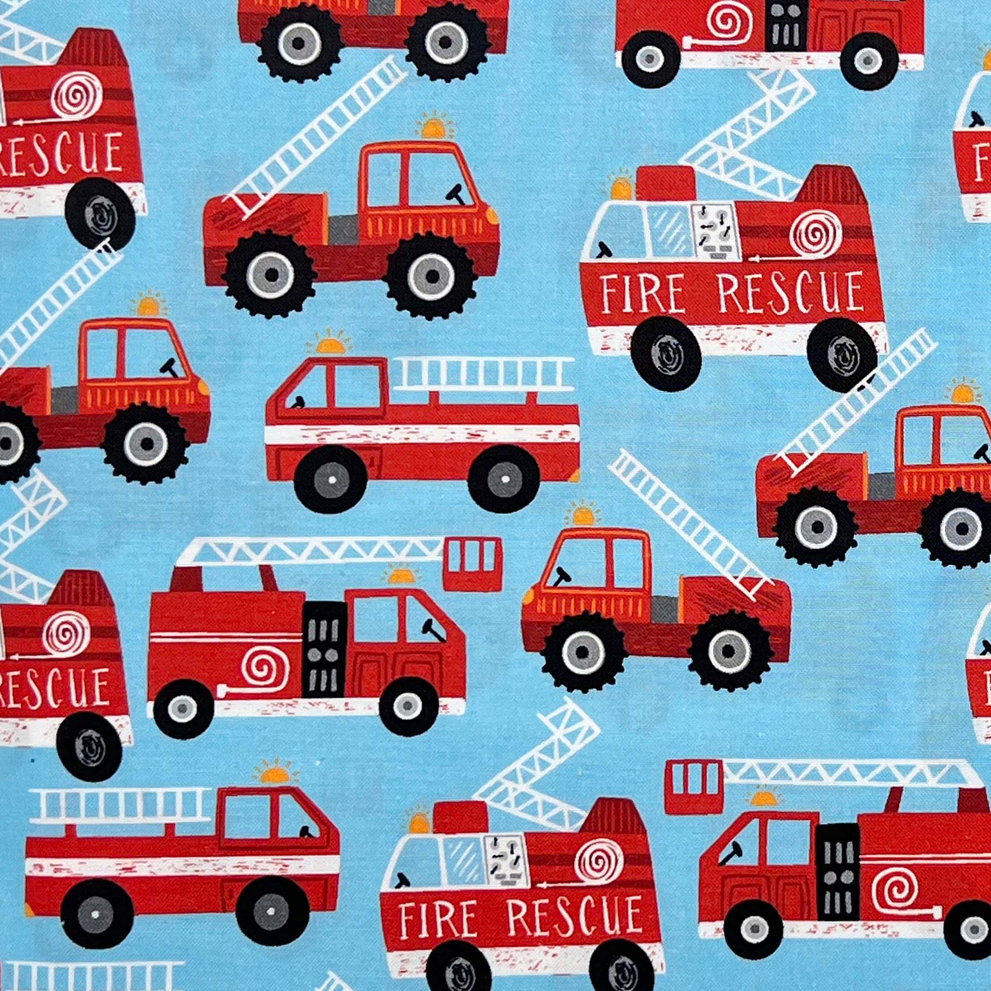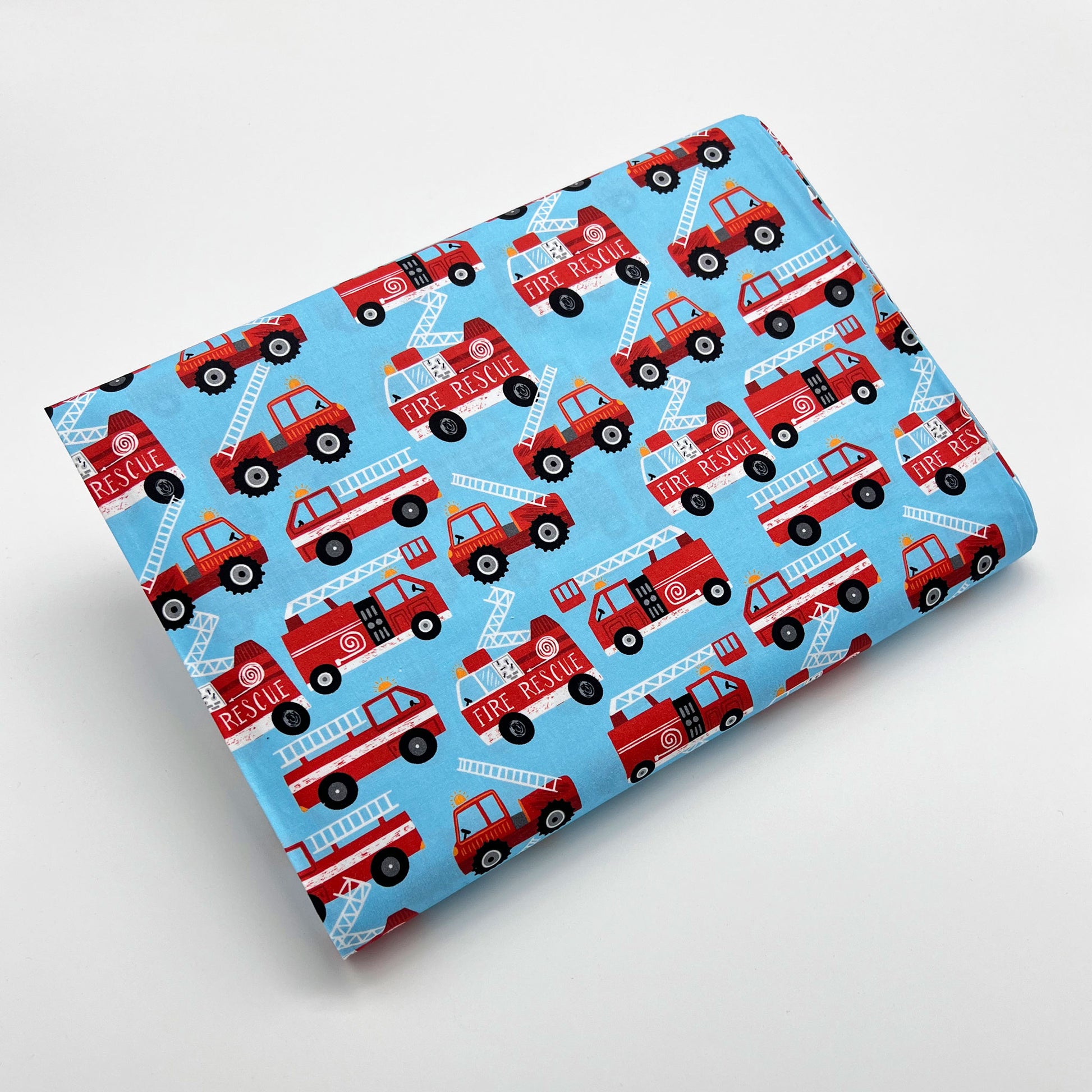 Tessuto a fantasia con camion dei pompieri su fondo azzurro