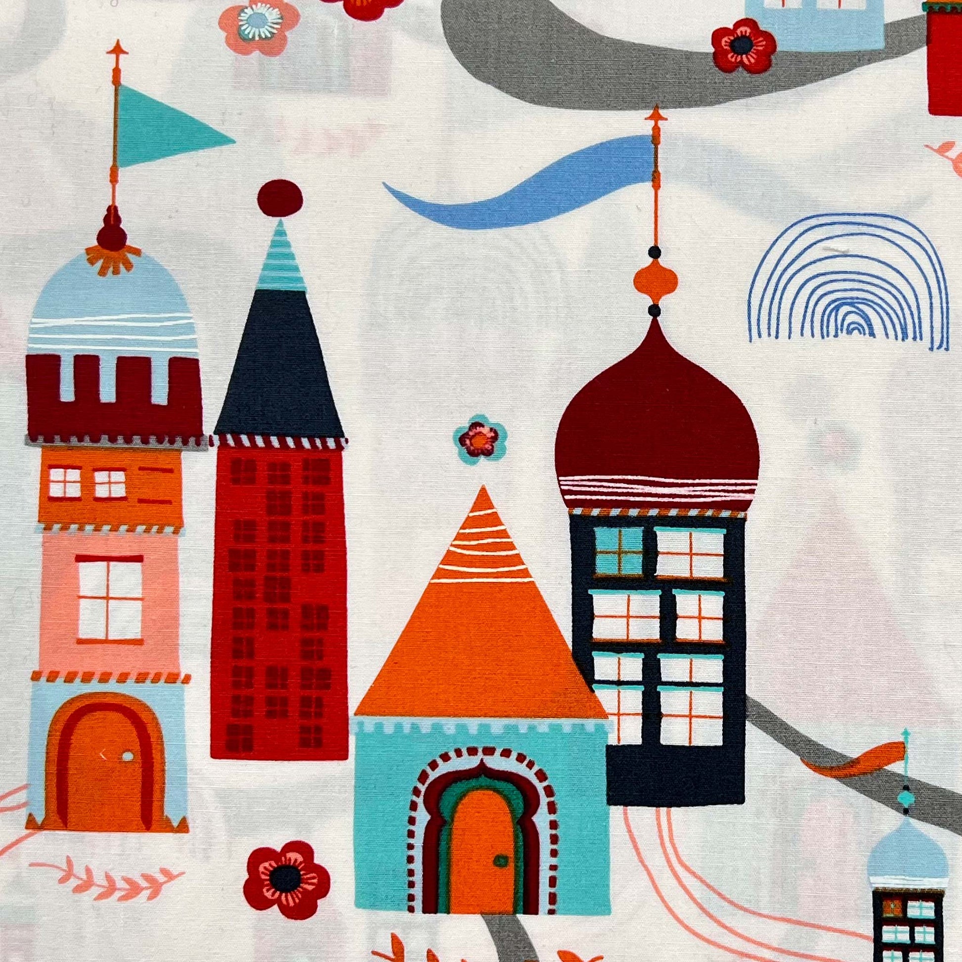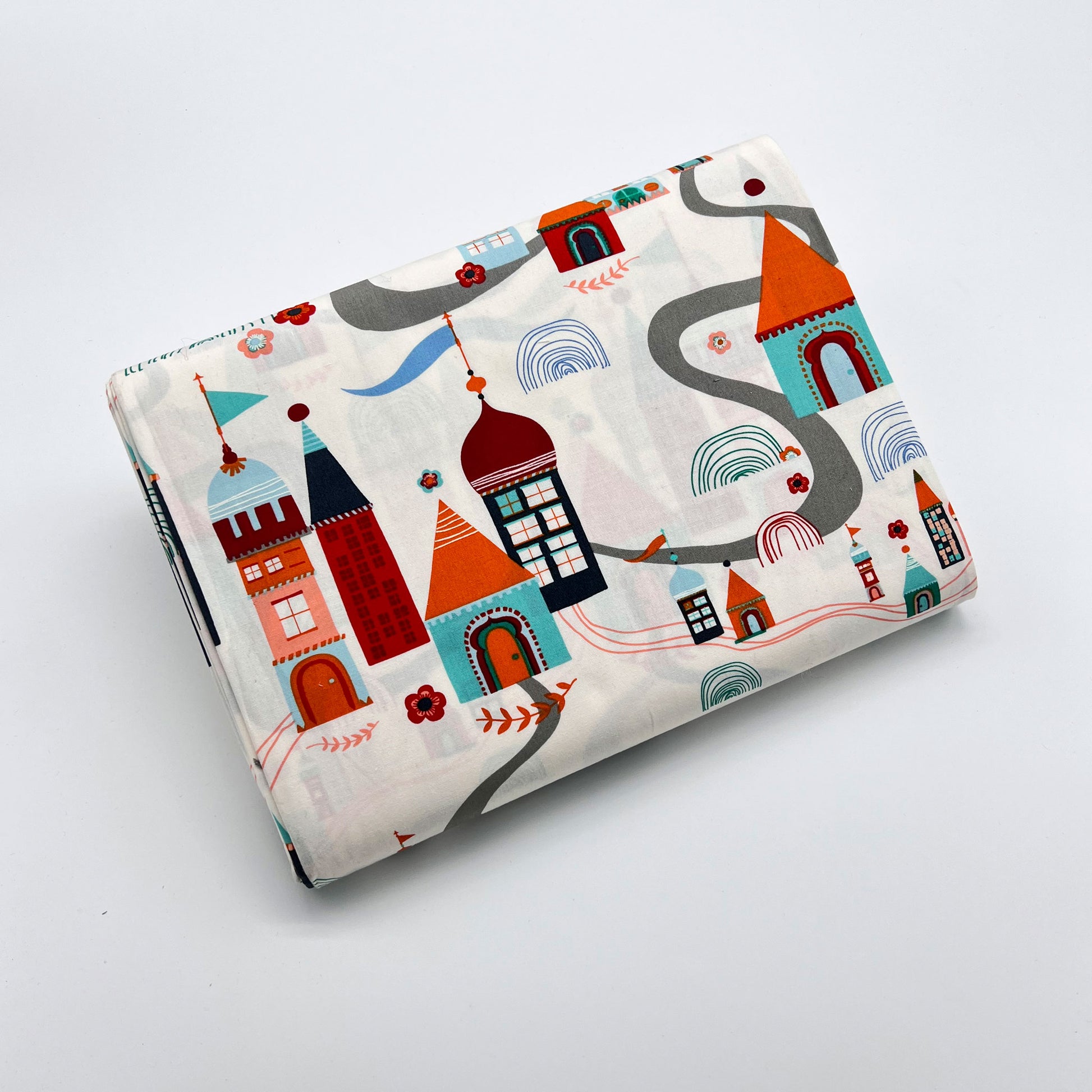 Tessuto a fantasia con case e villaggio su fondo bianco