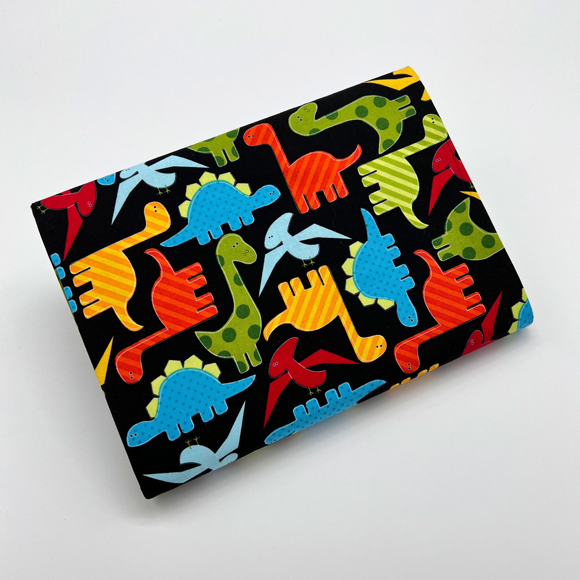 Tessuto a fantasia con dinosauri colorati su fondo nero