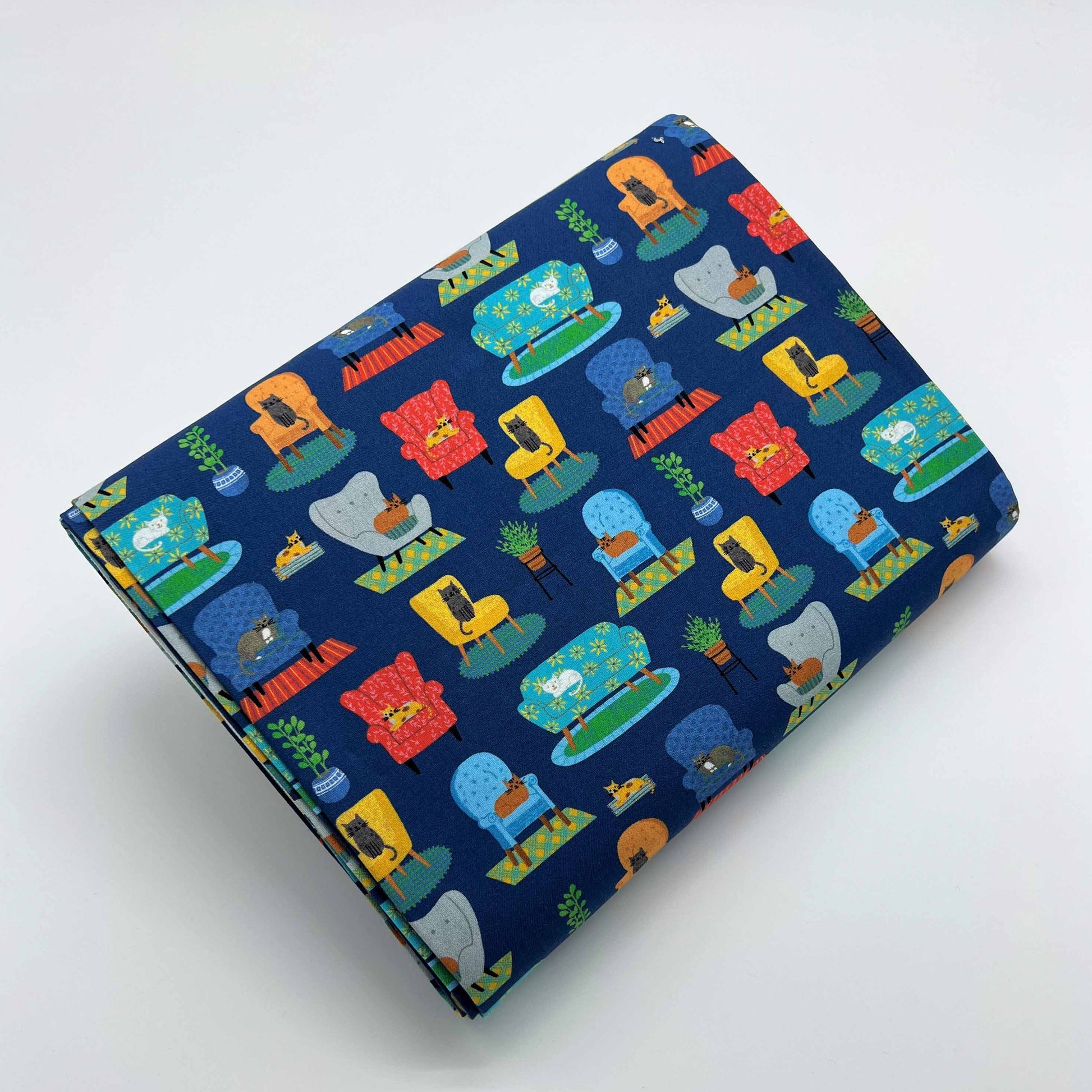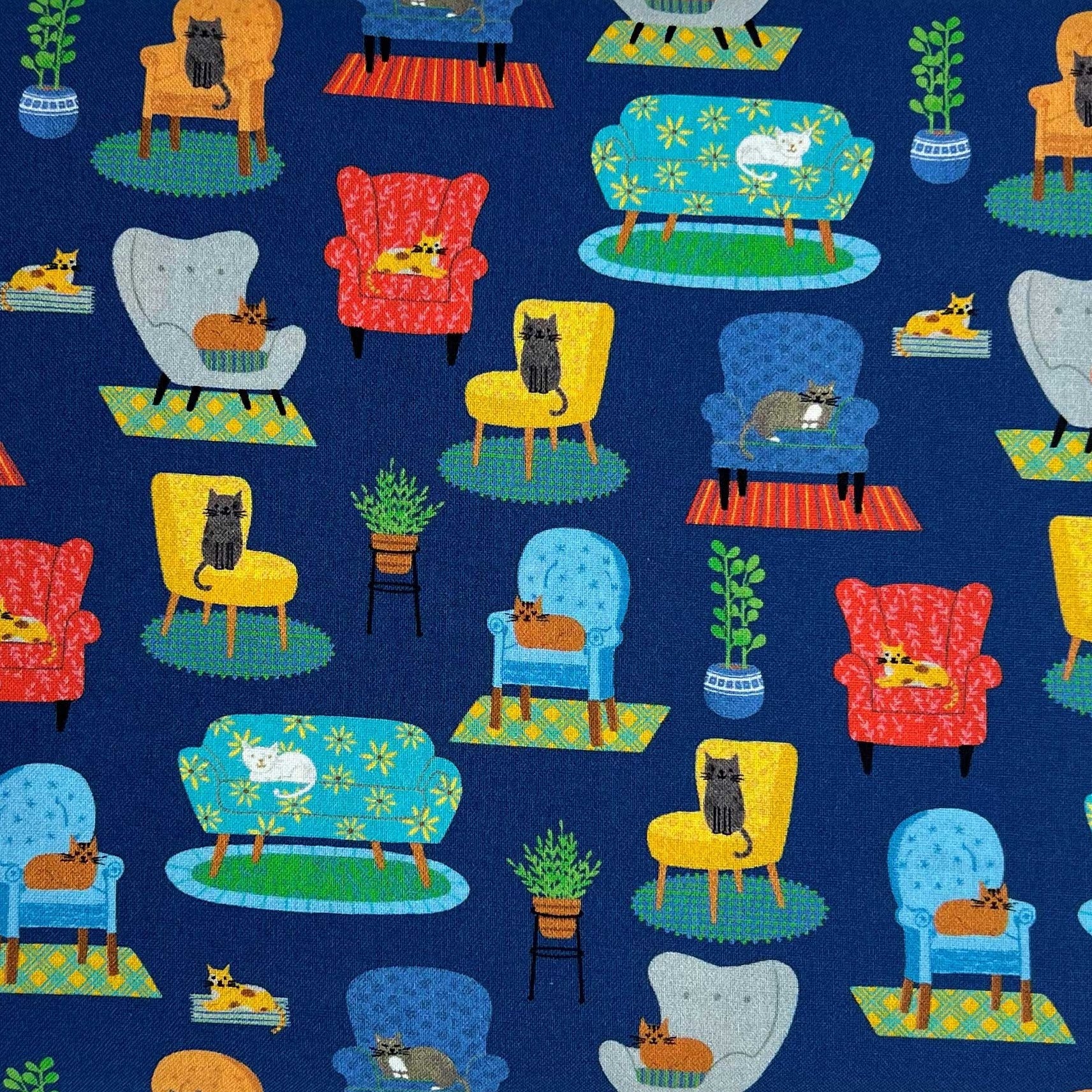 Tessuto a fantasia con gatti in poltrona e piante su base blu