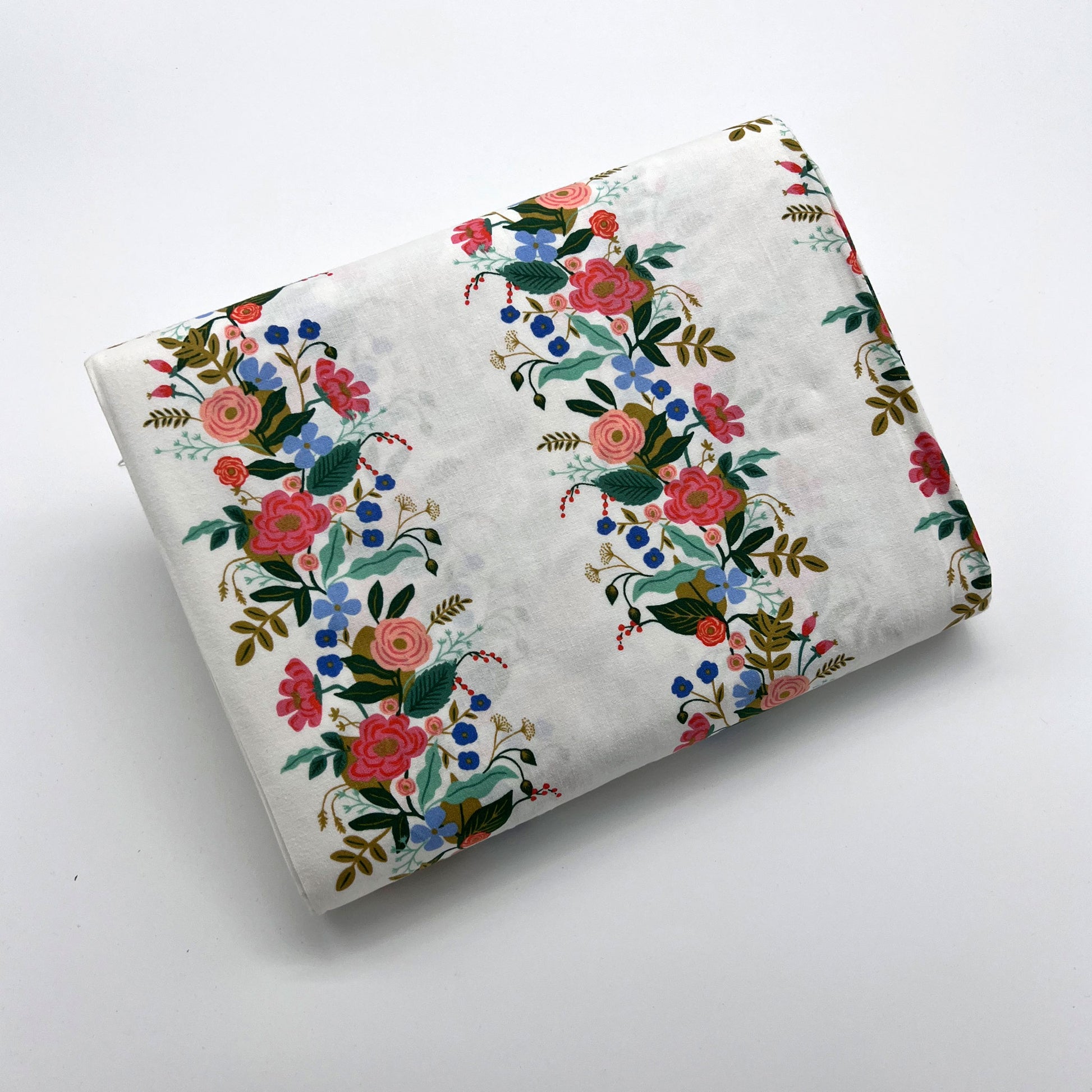 Tessuto a fantasia con ghirlande di fiori verticali su fondo bianco