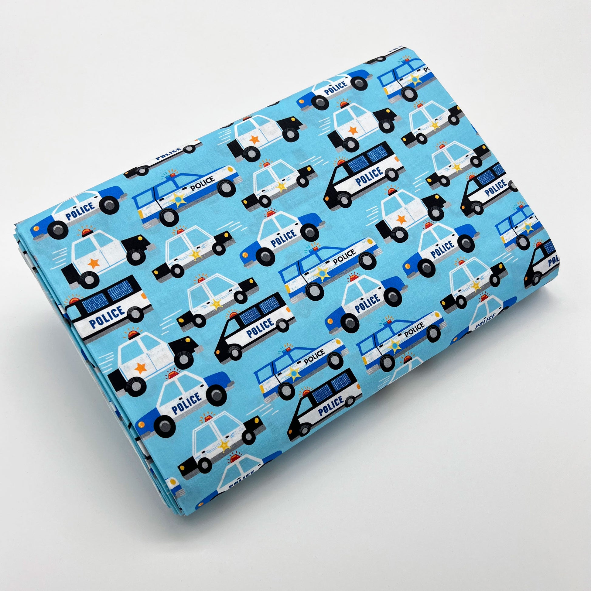 Tessuto a fantasia con macchine della polizia su fondo azzurro