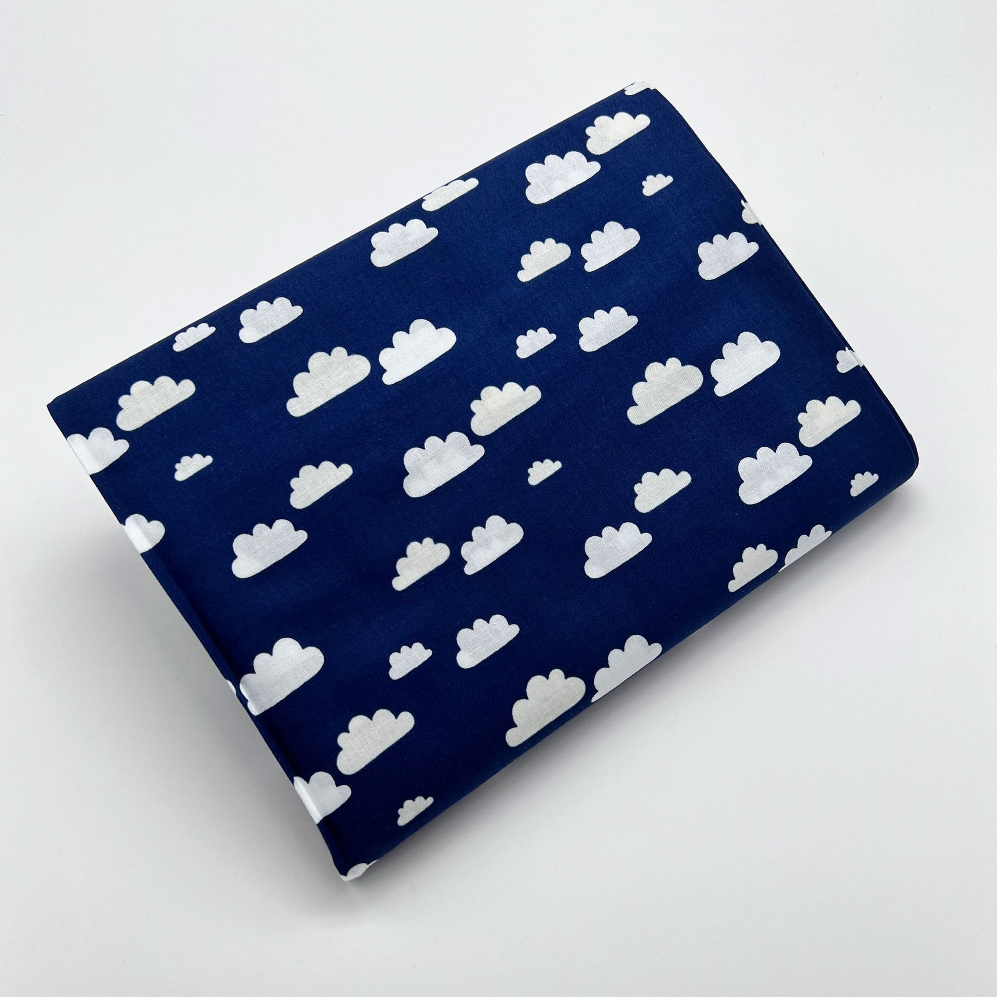 Tessuto a fantasia con nuvole bianche su fondo blu
