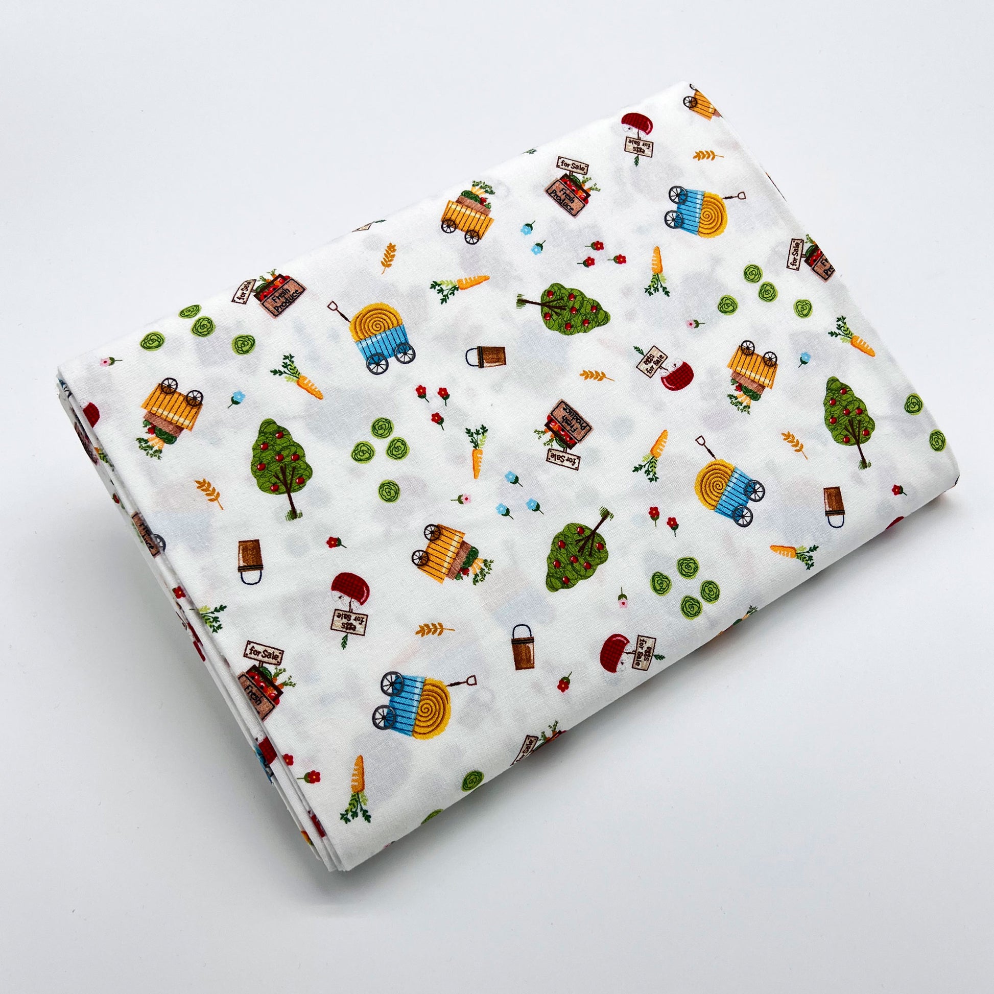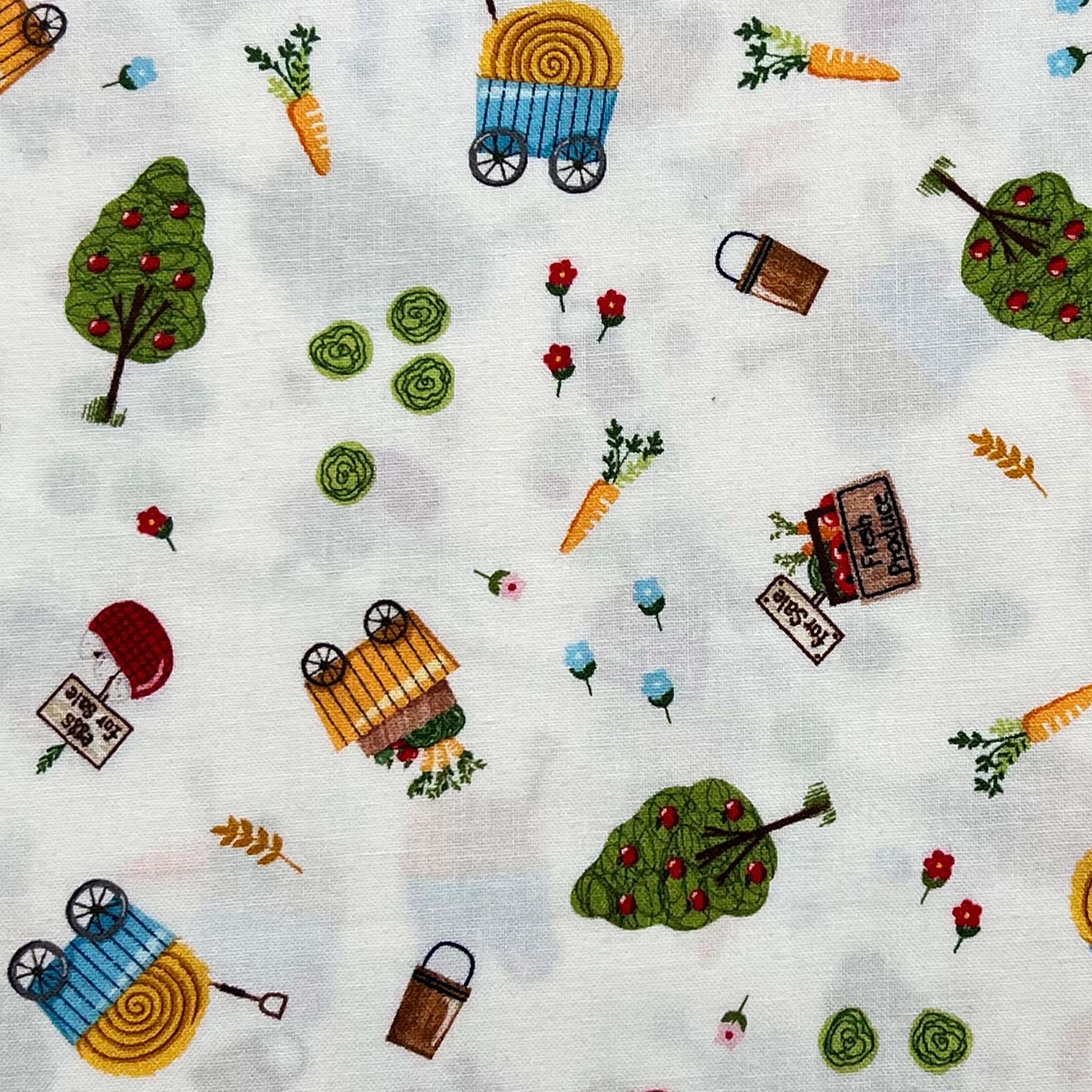Tessuto a fantasia con soggetti di campagna su fondo bianco
