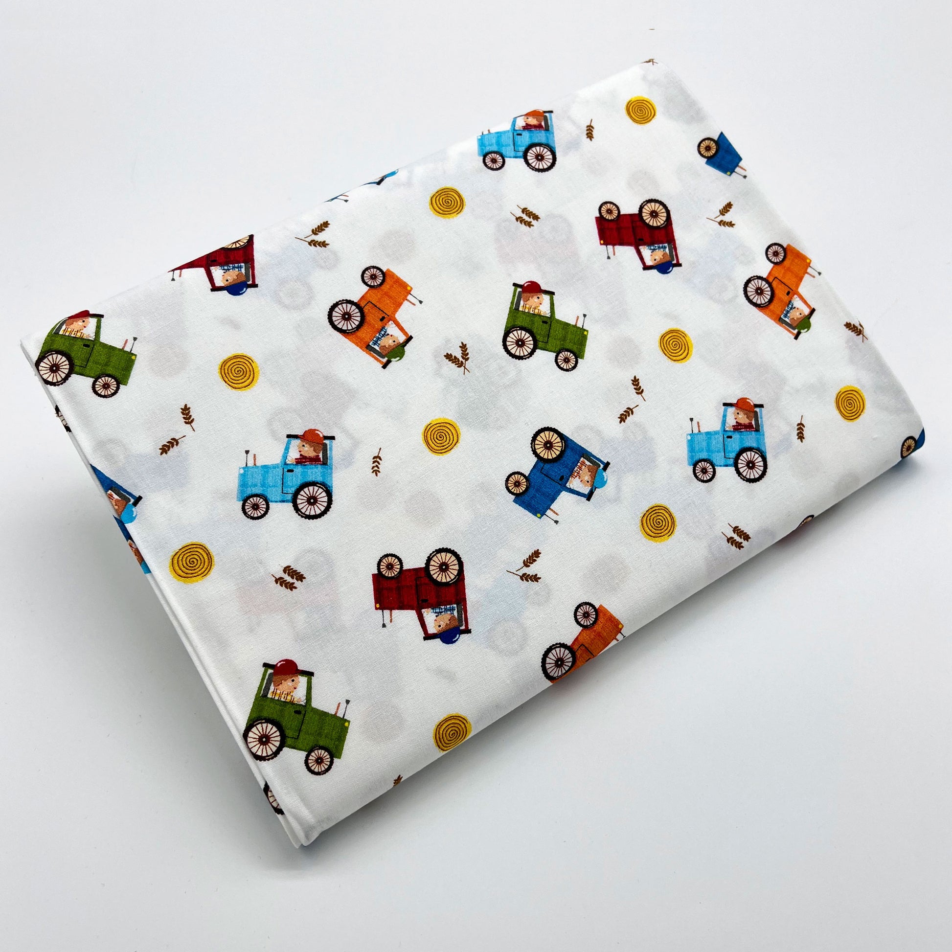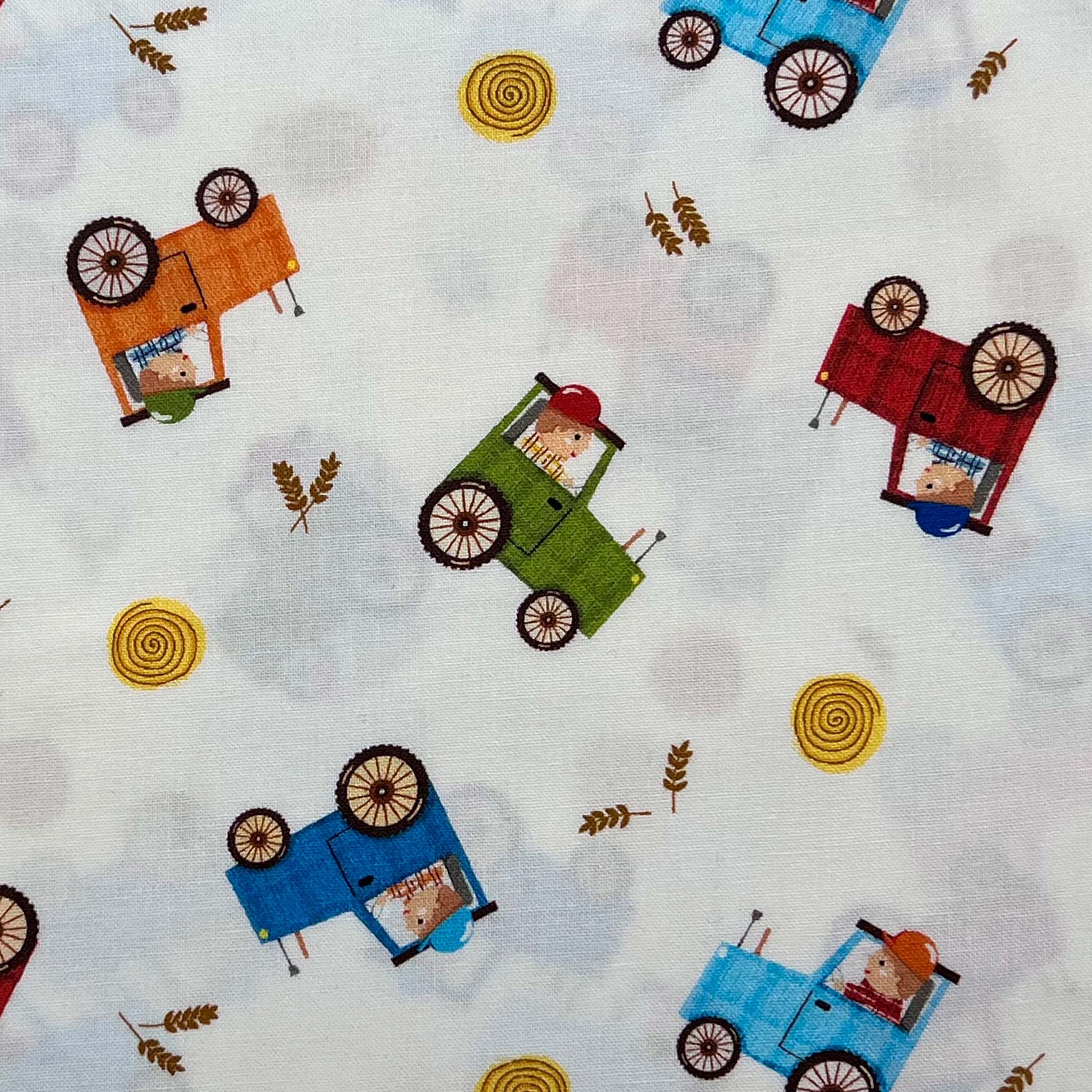 Tessuto a fantasia con trattori colorati su fondo bianco