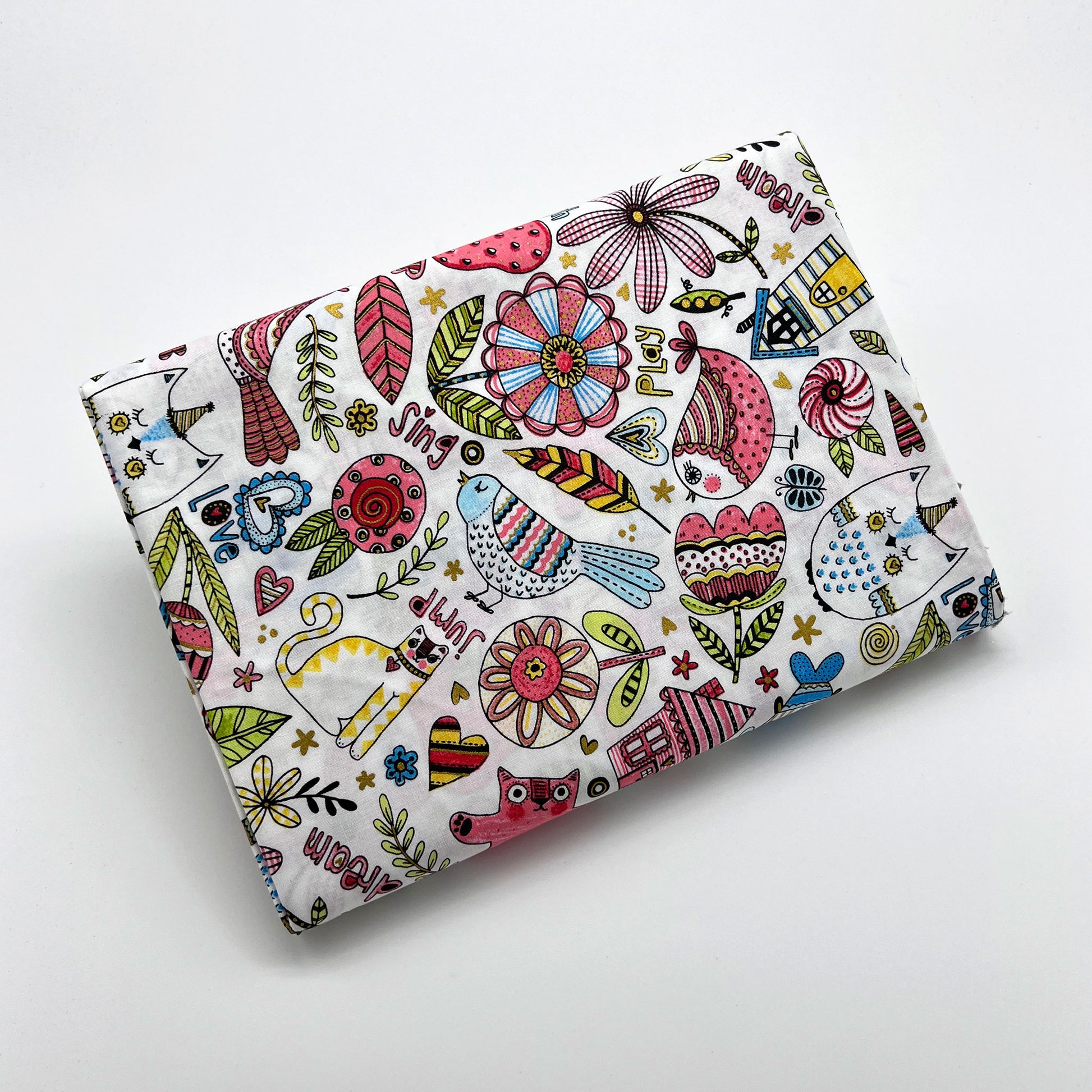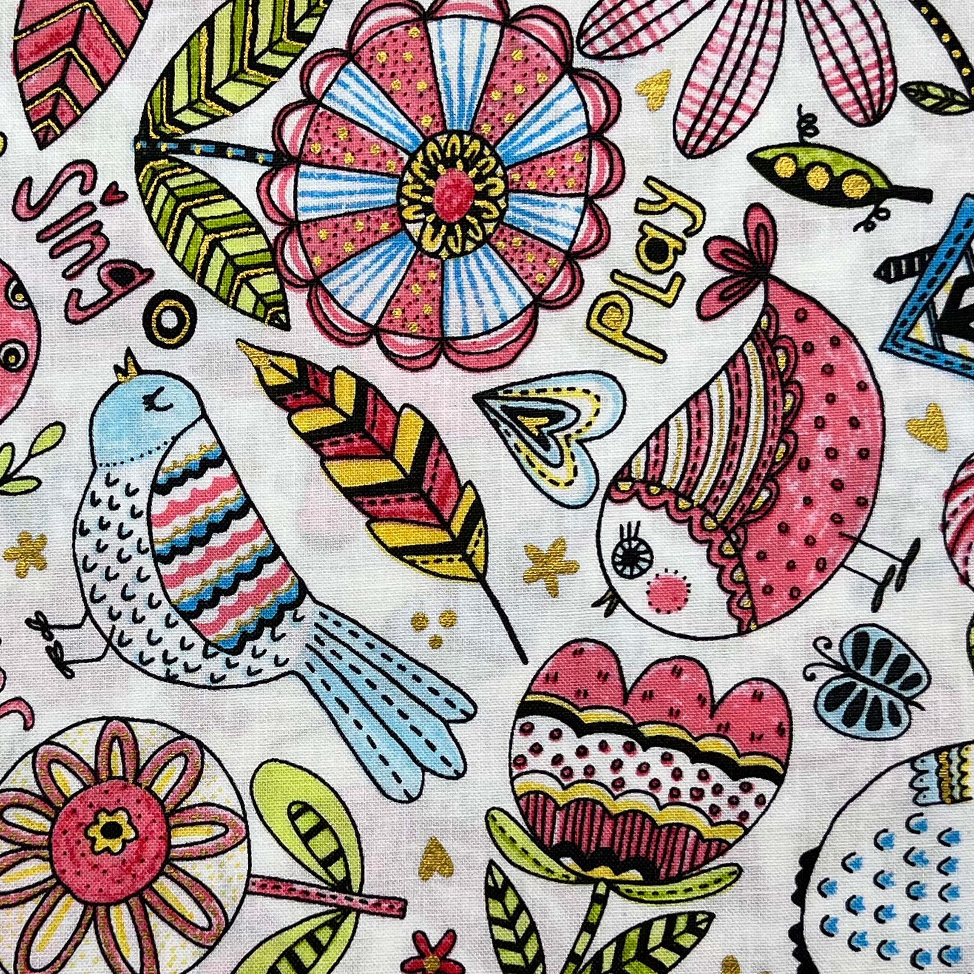 Tessuto a fantasia con uccellini e fiori su fondo bianco