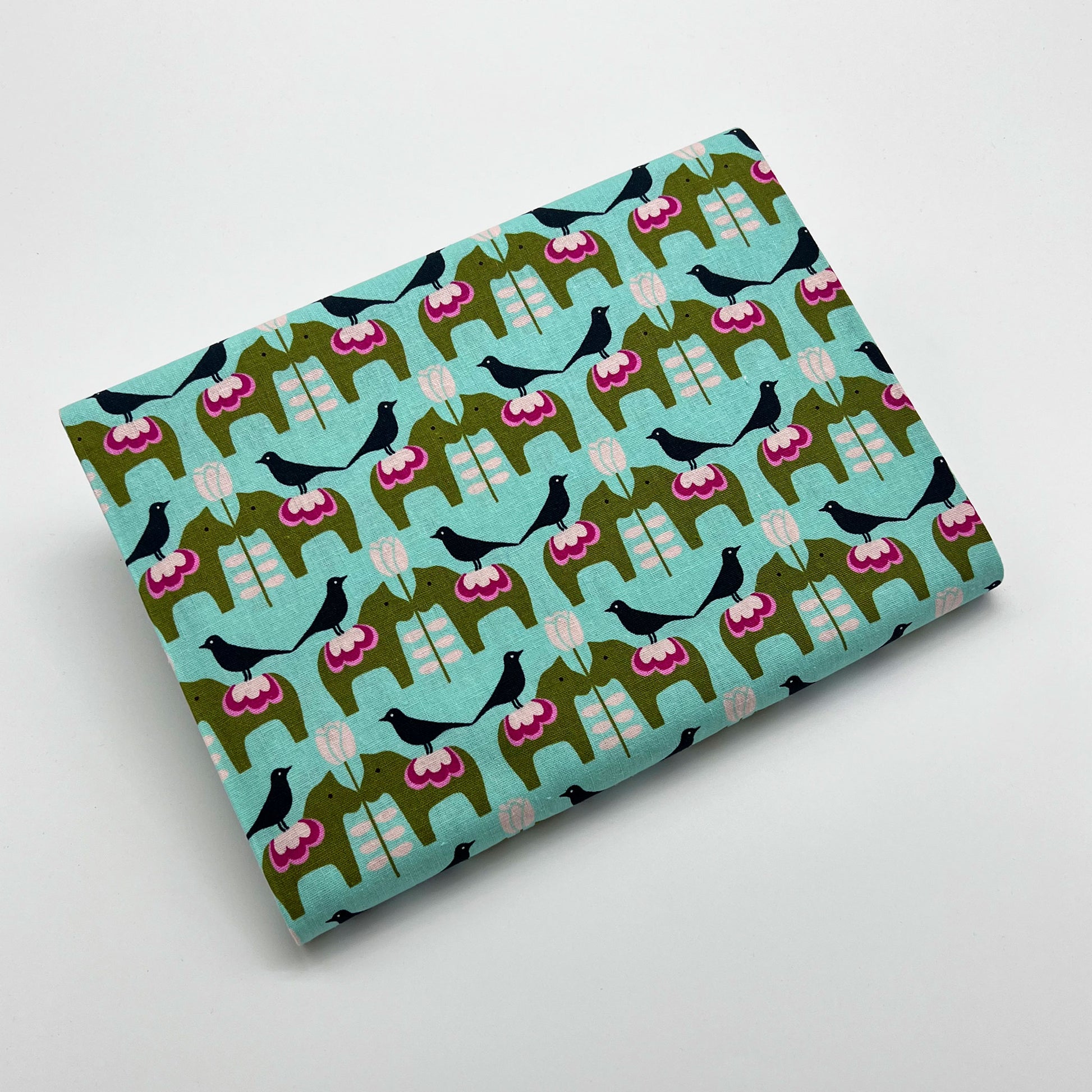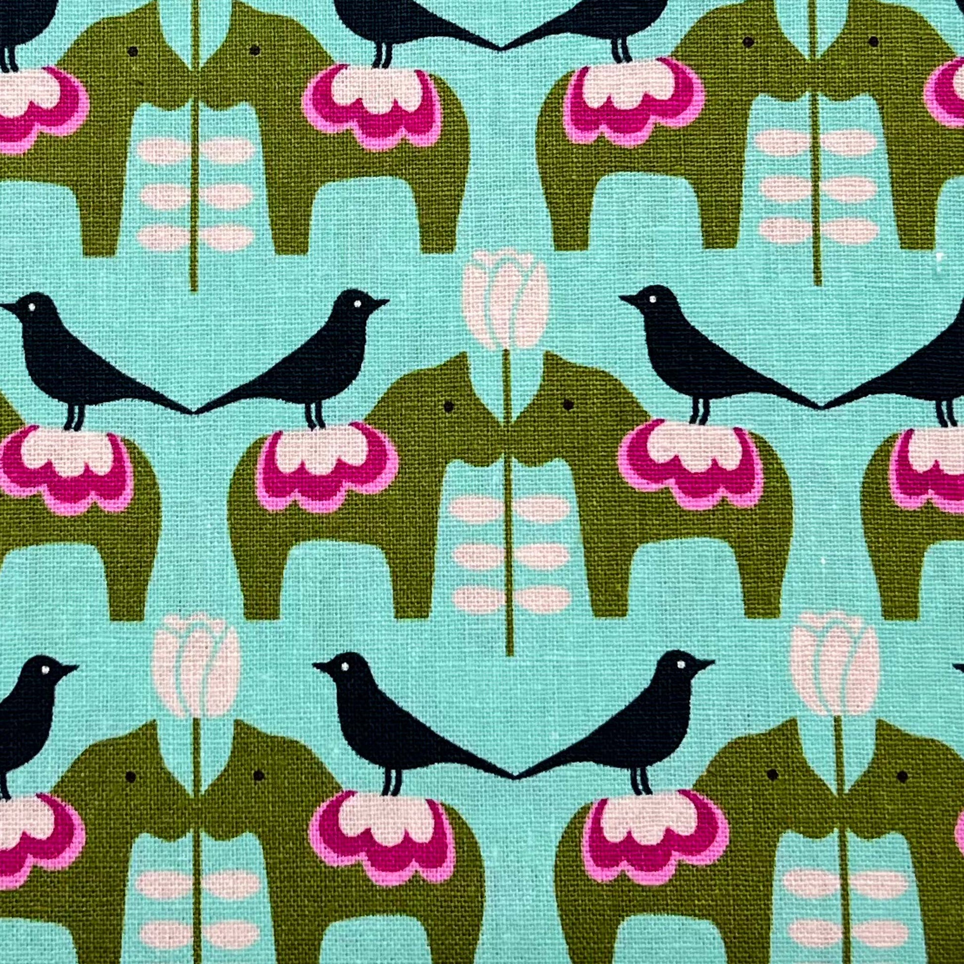 Tessuto a fantasia geometrica con animali su fondo verde acqua