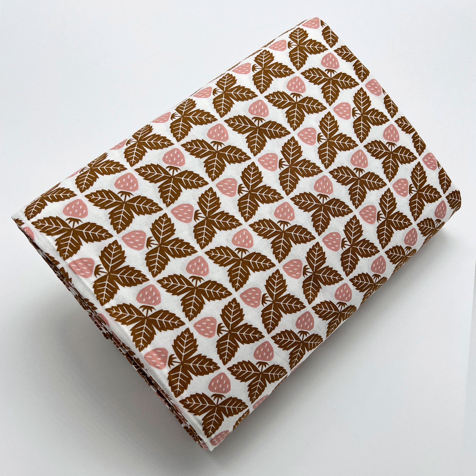 Tessuto a fantasia geometrica con fragole rosa su fondo bianco
