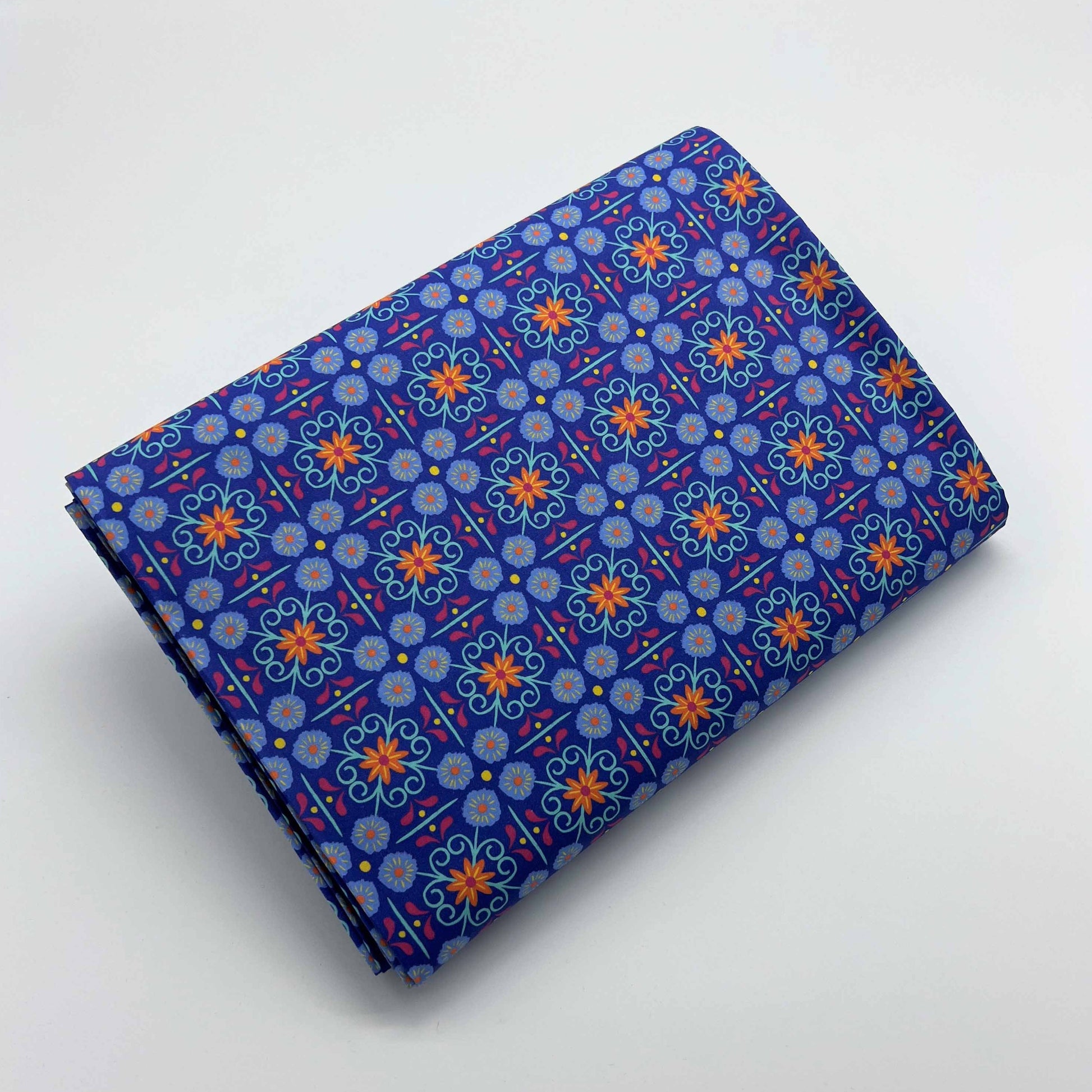 Tessuto a fantasia geometrica su fondo azzurro brillante